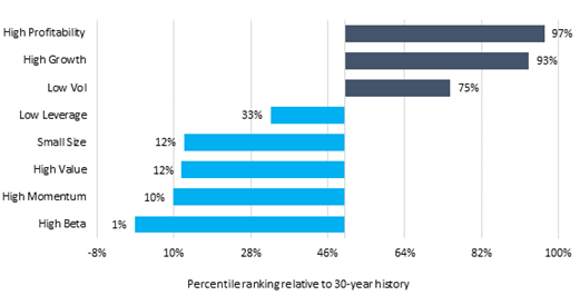 The market of the last ten years has been characterized by performance bifurcation, notably among growth/value and large/small, but in other areas as well. While these factors did not experience a notable change over the last few months, Momentum, which was a notable market driver over the last few years, did. As earnings estimates were revised lower at a rate not seen since the financial crisis, Momentum ended the month at the lowest 10% of its valuation over the last 30 years. Exhibit 4 shows where certain factors currently sit in their historical timeframe.
