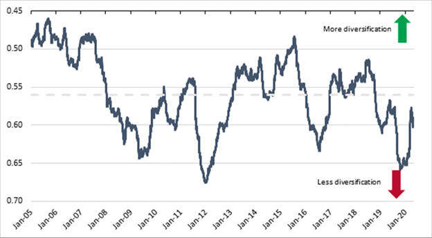 Source: Columbia Threadneedle Investments; Axioma; S&P 500 universe; Factor diversification is defined as the percentage of variance explained by the first three principal components of the returns of 11 Axioma measures of risk over a rolling 6-month period. The higher the explained variance, the lower the factor diversification, and vice versa. The dotted line equals the average of the period from January 1, 2005.