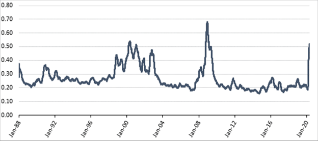 Source: Columbia Threadneedle Investments; as of April 30, 2020. Idiosyncratic risk is the average of the annualized standard deviation of their Beta-adjusted daily returns in the past 3 months, for all S&P 500 stocks.